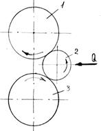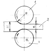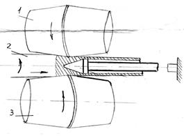 Из простейшей схемы поперечной прокатки видно, что оси прокатных валков 1 и 3 обрабатываемой заготовки 2 параллельны (или пересекаются под небольшим углом) (рис.2). Оба валка вращаются в одном направлении, а заготовка круглого сечения – в противоположном.