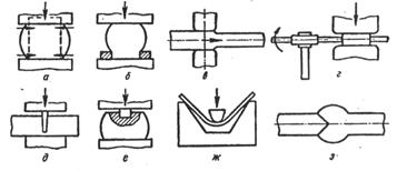 а – осадка; б – высадка; в – вытяжка; г – кручение; д – рубка; е – прошивка; ж – гибка; з – сварка.