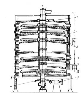 Многоподовыепечи (рис. 1) получили широкое распространение в странах Западной Европы и США для сжигания отходов, в первую очередь, осадков городских сточных вод. Печь состоит из цилиндрического стального корпуса 1, футерованного огнеупором, с поэтажно расположенными подами 2. По оси печи располагается охлаждаемый воздухом полый вал 3 с гребковыми лопастями 4. Вал приводится во вращение от расположенного внизу электропривода 5 и передаточного механизма 6. Гребковые лопасти, так же как и вал, выполняются пустотелыми. Через них в процессе работы подается воздух для охлаждения металлических поверхностей. Влажный продукт перемещается гребковыми лопастями сверху вниз от пода к поду навстречу дымовым газам. За счет тепла идущих в противотоке дымовых газов происходит подсушивание отходов, а затем их воспламенение, для чего дополнительно используют горючий газ. Зола, выходящая из патрубка 8, обычно гасится водой, которая затем направляется в отвал.