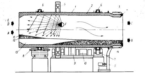 Д - дополнительное топливо; Е - воздух; Г - тепловое излучение; 1 -корпус барабанной печи; 2 - футеровка; 3 - разгрузочный торец; 4 -присоединительные сегменты; 5 - вентилятор; 6 - бандажи; 7 - ролики опорные; 8 - ролики боковые; 9 - зубчатый венец; 10 - привод;11 - зона испарения воды; 12 - отходы; 13 -- зона горения; 14 - зола (шлак)