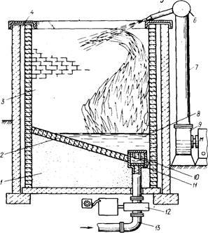 Рис. 3. Американская установка надслоевого горения: 1 - песчаное основание; 2 - днище камеры сгорания; 3 - камера сгорания; 4 - воздушный зазор; 5 - сопло; 6 - коллектор; 7 - напорный воздуховод; 8 - слой жидких отходов; 9 - вентилятор; 10 - отверстия, клапанной коробки; 11 - клапанная коробка; 12 - насос; 13 - трубопровод