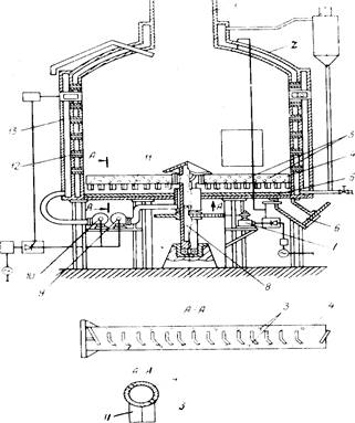 1 - газоход; 2 - камера сгорания; 3 - отверстия для воздуха; 4 – радиальные лопасти; 5 - днище; 6 - разгрузочный люк: 7 - привод; 8 - пустотелый вал; 9, 10 - воздуходувки; II - скребки; 12 - воздушные отверстия; 13 - кольцевая полость