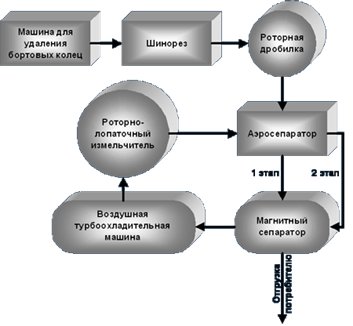 Изношенные автомобильные шины подаются в машину для удаления бортовых колец. После этого шины поступают в шинорез и далее в ножевую роторную дробилку. Затем следует магнитный сепаратор и аэросепаратор. Для охлаждения порезанные и предварительно очищенные куски резины подаются в холодильную камеру, где охлаждаются до температуры -50 град.С...-90 град.С. Холодный воздух для охлаждения резины подается от генератора холода воздушной турбохолодильной машины. Далее охлажденная резина попадает в роторно-лопаточный измельчитель, откуда она направляется на повторную очистку в магнитный сепаратор и аэросепаратор, где отбирается резиновая крошка менее 1 мм ... 0,5 мм, а также более крупная и затаривается в мешки и отправляется к заказчику.