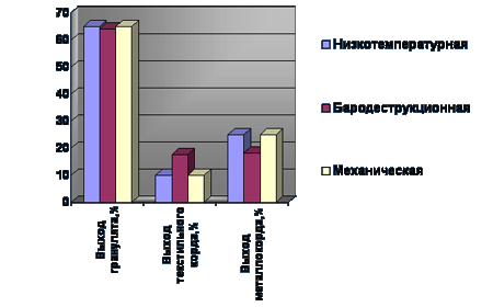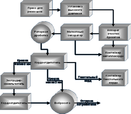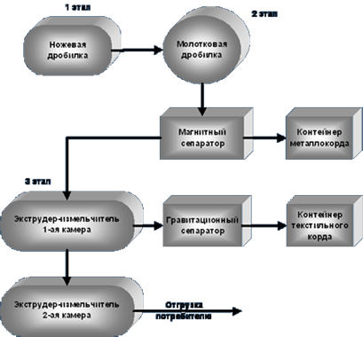 Отделившийся от резины текстильный корд поступает в контейнер. В случае если резиновая крошка фракцией более 3 мм интересует потребителя как товарная продукция, то она фасуется в бумажные мешки, если нет, то она попадает в экструдер-измельчитель. После измельчения вновь в кордоотделитель. Текстильный корд - в контейнер, а резиновая крошка - в вибросито, где происходит дальнейшее её разделение на три фракции: I - от 0,3 до 1,0 мм; II - от 1,0 до 3,0 мм; III - свыше 3,0 мм.