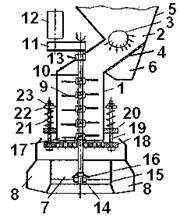 За лопастным ротором с зазором 17 установлена колосниковая решетка 18. Она снабжена направляющими 19, которые пропущены через кронштейны 20 и не допускают ее вращательного движения, позволяют фиксировать и перемещать решетку 18 в осевом направлении посредством механизма регулирования : пружины 21, шайбы 22 и гайки 23, регулируя тем величину кольцевого зазора 17. Эта величина устанавливается такой, при которой получают дробленый продукт заданной крупности, т.е. соблюдается условие прохождения материала через отверстия решетки 18 без переизмельчения.