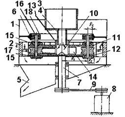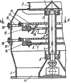 В течке 7 часть дробленого продукта отводится вращающейся совместно с в алом 10 крышкой 16 от упорного подшипника 14, предохраняя его от забивания материалом.
