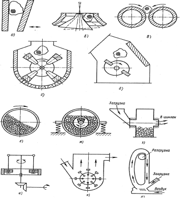 а - щековая дробилка; б - конусная; в - валковая ударного действия; г - молотковая дробилка; д - роторная для помола каменных материалов; мельницы: е - вращающиеся с мелющими телами; ж - вибрирующие с мелющими телами; з - истиранием частиц материала друг о друга; и - среднеходные роликовые; к - ударные; л – струйные.