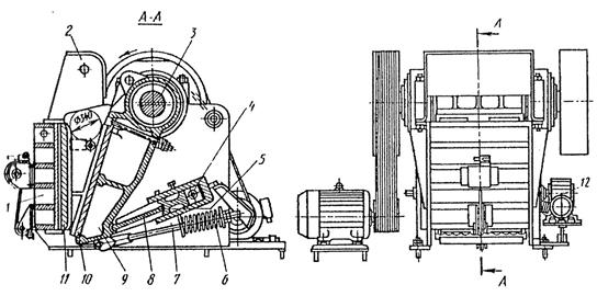 Станина щековой дробилки со сложным движением подвижной щеки (рис. 3) сварная. Ее боковые стенки соединены между собой передней стенкой 1 коробчатого сечения и задней балкой 4. Последняя также является корпусом регулировочного устройства. Над приемным отверстием укреплен защитный кожух 2, предотвращающий вылет кусков породы из камеры дробления. Подвижная щека 9 представляет собой стальную отливку, которая расположена на эксцентричной части приводного вала 3. В нижний паз вставлен сухарь для упора распорной плиты 8. Другим концом распорная плита упирается в сухарь регулировочного устройства 5 с клиновым механизмом. Замыкающее устройство состоит из тяги 7 и цилиндрической пружины 6. Натяжение пружины регулируют гайкой. При ходе сжатия пружина сжимается. Стремясь разжаться, она способствует возврату щеки и обеспечивает постоянное замыкание звеньев шарнирно-рычажного механизма - подвижной щеки, распорной плиты, регулировочного устройства. Предохранительное устройство представляет собой распорную плиту, которая ломается при нагрузках, превышающих допустимые (например, при попадании в камеру дробления недробимых предметов). Более рациональными являются предохранительные устройства, которые не разрушаются при повышении нагрузок. Такие устройства бывают пружинными, фрикционными, гидравлическими. Жесткость пружин должна обеспечивать работу дробилки при обычных нагрузках. При попадании в камеру дробления недробимых предметов пружины сжимаются на величину, необходимую для поворачивания эксцентрикового вала при остановившейся подвижной щеке.