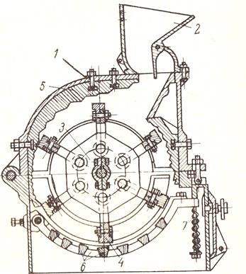 1-корпус; 2-приемная воронка; 3-ротор; 4-молоток; 5- броневая плита; 6-решетка; 7-пружина