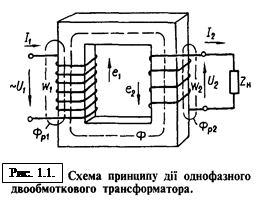 Під час вмикання первинної обмотки трансформатора до мережі змінного струму з напругою U1 у ній виникає струм I1 , який збуджує в магнітопроводі змінний магнітний потік Ф. Замикаючись по магнітопроводу, змінний магнітний потік перетинає витки обмоток та індукує в первинній обмотці (w1 ) е.р.с. е1 , а у вторинній обмотці (w2 ) е.р.с. е2 .