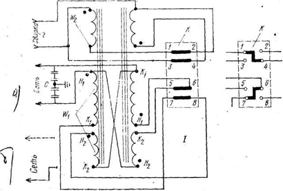 С - фільтр захисту від радіопошкоджень (конденсатори КБГ-И; 0,02 мкФ; Uроб.=600 В); К - перемикач діапазону струмів; W1 — первинна обмотка, W 2 – обмотка вторинна;
