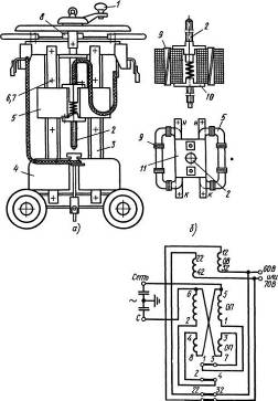 Принцип дії трансформатора ґрунтується на явищі електромагнітної індукції. Він складається з корпусу, в середині якого розміщений магнітопровід 1 (осердя), зібраний з тонких (0,5 мм) лакованих пластин електротехнічної сталі (рис. 2.1) і на якому розміщені первинна 3 та вторинна 2 обмотки. Для підвищення коефіцієнта трансформації в трансформаторах ТСК використовують батарею конденсаторів 4, яку вмикають паралельно до первинної обмотки.