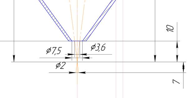 100/х = 14/1, следовательно расстояние от точки фокуса до обрабатываемой поверхности равно 7 мм. А общее от сопла 17мм.