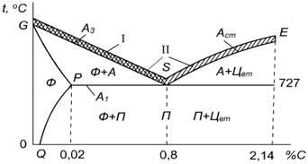 Рис. 3. Интервал температур термической обработки (І – полный отжиг, ІІ – нормализация).