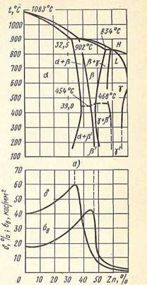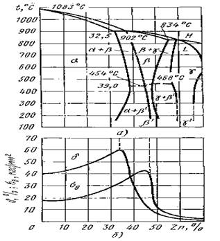 Рис. 4. Диаграмма состояния Си – Zn (а) и влияние цинка на механические свойства меди (б)