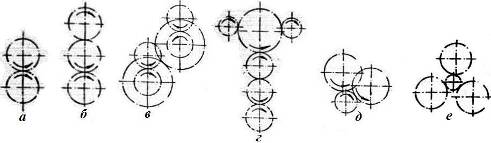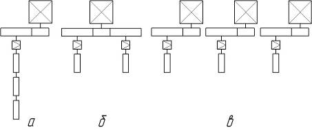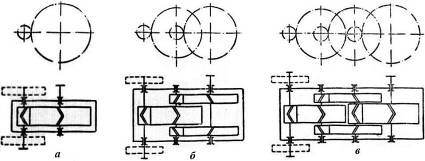 Схемы групповых редукторов с цилиндрическими зубчатыми колёсами, пользующиеся наибольшим распространением, изображены на Рис. 5,а-в.