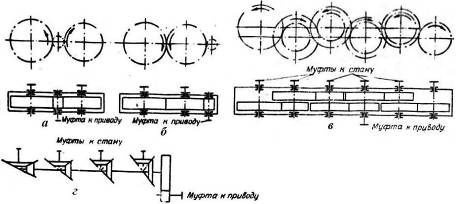 В случаях, когда требуется передача движения нескольким линиям прокатного стана, при небольшом расстоянии между их осями (например, в мелкосортных непрерывных станах), находят применение редукторы согласно схеме, изображенной на Рис. 5,в, причём для того, чтобы получить вращение валков во всех линиях в одну сторону, оси зубчатых колёс располагают в двух плоскостях, присоединяя валы колёс поочерёдно то к нижней, то к верхней шестерне шестерённой клети. Диаметр зубчатых колёс делается разным в зависимости от требуемого числа оборотов в каждой линии.