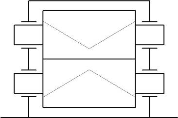 На Рис. 5,а и б приведены схемы редукторов, когда от данного двигателя приводятся две линии прокатного стана. Схема на Рис. 5,а относится к станам, когда направление вращения валков в обеих линиях одинаковое, а схема на Рис. 5,б находит применение, когда валки в обеих линиях вращаются в противоположных направлениях. Диаметр ведомых шестерен бывает разный, в зависимости от требуемого числа оборотов валков в каждой линии.