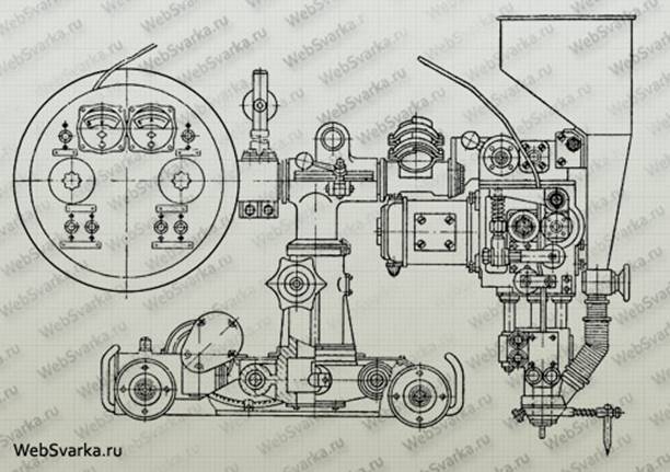 В первую очередь следует отметить механизмы перемещения дуги вдоль шва, затем механизмы регулирования и установочных перемещений автомата и изделия. Часто существенное значение имеют транспортные приспособления для укладки, поворачивания и перемещения изделий. Кроме того, необходимы электрические измерительные и регулировочные приборы, подводка электрического тока, флюсовая аппаратура и разные специальные устройства. Необходим источник тока, питающий автоматическую установку с относящейся к нему аппаратурой; чаще всего это - однофазный сварочный трансформатор.