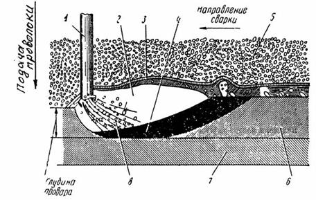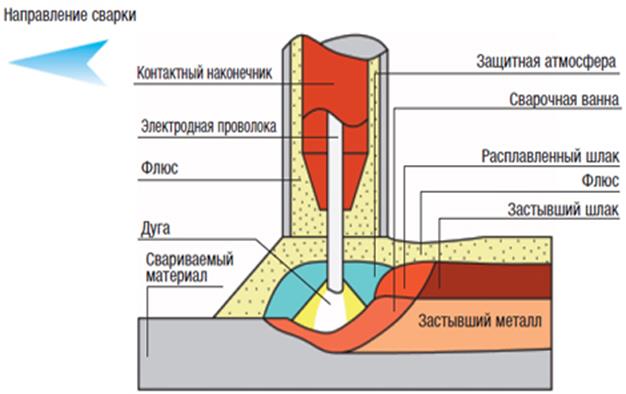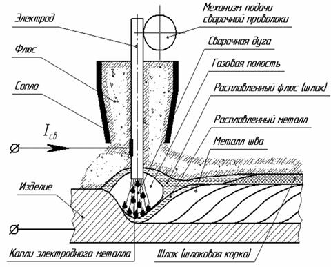 Сущность процесса автоматической сварки заключается в следующим: голая электродная проволока с катушки подаётся в зону дуги автоматической головкой, двигающейся вдоль шва; впереди головки из бункера по трубе на свариваемые кромке подаётся флюс, покрывающий поверхность металла в зоне шва слоем толщиной 50 –60 мм. Электрическая дуга горит под слоем флюса в создаваемом ею газом пузыре, окруженном средой расплавленного флюса.