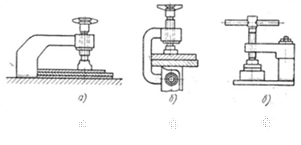 К переносным приспособлениям относятся всевозможные струбцины, стяжки, специальные фиксаторы, распорки, домкраты и др. Наиболее часто применяются струбцины, конструкции которых приведены на рис 9.