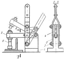 Рычажные прижимы представляют собой рычаги 1 - го или 2 - го рода или их комбинацию и используются как усилители приводов зажима. Пример, такого зажима показан на рисунке 8. Он состоит из стойки 1, на оси 2 которой имеется ведущий рычаг 3 и промежуточное звено 4, действующие на силовой рычаг 5. Прижим детали осуществляется упором 6. Как правило, такие прижимы имеют регулируемые или упругие звенья, позволяющие крепить детали различных толщин. Весьма перспективными являются рычажно - винтовые, рычажно - эксцентриковые и другие комбинированные приспособления.