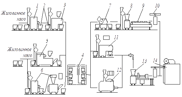 мясо через промежуточные емкости 2 и 3 поступает в волчок 4 первичного измельчения. Измельченное мясо после перемешивания с солью (массовая доля соли в сырокопченых колбасах не должна превышать 3 %) насосом 6 перекачивается в бункер 7 для созревания фарша в посоле. Бункер 7 перемещают по монорельсу 5.
