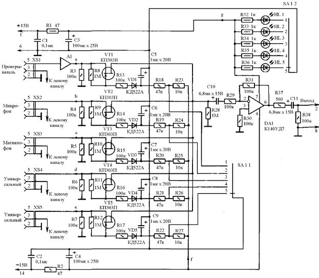 В состав усилителя входят: усилитель мощности, регуляторы громкости и тембра, входной коммутатор на 5 входов, микрофонный усилитель, нормирующий усилитель, индикатор выходной мощности, источник питания, усилитель-корректор АЧХ, электрически не связанный с прочими узлами