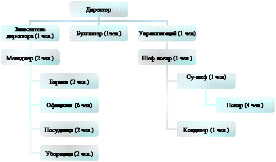Менеджер (2 чел) Подчиняется заместителю директора, управляющему. Является непосредственным начальником заведения для обслуживающего персонала в отсутствии вышестоящего руководства. Следит за работой персонала, производит кассовые операции.