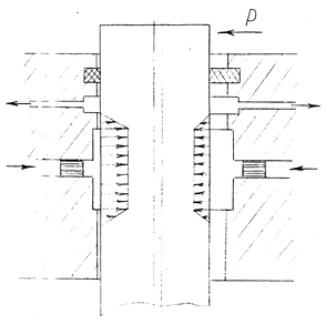 . При воздействии на шток боковой силы (см. рис.3) с противоположной ей стороны уменьшается зазор и повышается сопротивление истечению и, следовательно, давление в соответствующем кармане подшипника. На противоположной стороне зазор увеличивается, сопротивление истечения уменьшается и давление в камере падает. Т.о, создается гидравлическая восстанавливающая сила, центрирующая шток. Пока несущая способность подшипника не будет превышена, шток-поршень будет плавать в масле и работать в режиме жидкостного трения.