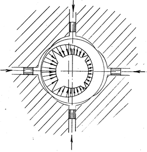 При работе гидростатического подшипника жидкость из линии нагнетания подается в карманы через дроссели лабиринтного типа. В зависимости от количества дроссельных шайб и сопротивления истечения жидкости из карманов, зависящего от величины радиального зазора, в карманах подшипников создается давление