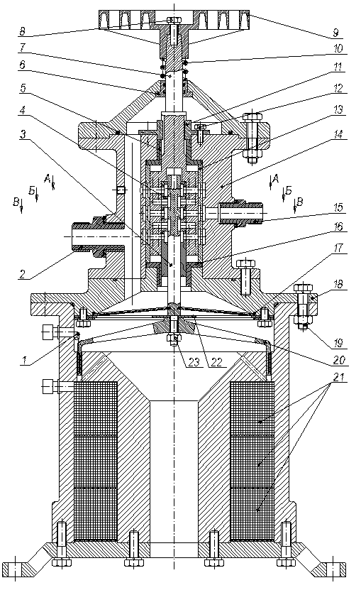б.) Вторым основным узлом является электромеханический преобразователь электродинамического типа (ЭДП), с помощью которого входной электрический сигнал (поступает обычно со звукового низкочастотного генератора и усиливается по мощности электронным усилителем) преобразуется в механическое перемещение золотника. ЭДП является естественным продолжением корпуса гидродвигателя и крепится к нему с помощью законтренных пружинными шайбами болтов 19. Обмотки 21 создают магнитное поле подмагничивания и запитываются от источника постоянного тока (выпрямителя, аккумуляторной батареи). Обмотка подмагничивания 21 ЭДП выполнена многосекционной (трехсекционой), что позволяет при электрическом пробое ее менять только часть обмотки подмагничивания (обмотка подмагничивания содержит иногда свыше десятка кг и более медного провода и является дорогой).