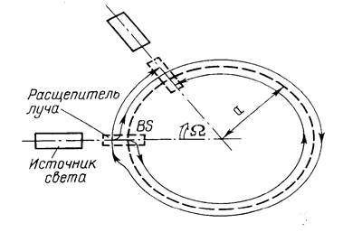 Принцип действия оптического гироскопа основан на эффекте Саньяка. По круговому оптическому пути, как показано на рис. 1, благодаря расщепителю луча свет распространяется в двух противоположных направлениях. Если при этом система находится в покое относительно инерциального пространства, оба световых луча распространяются встречно по оптическому пути одинаковой длины. Поэтому при сложении лучей в расщепителе по завершении пути нет фазового сдвига. Однако, когда оптическая система вращается в инерциальном пространстве с угловой скоростью W, между световыми волнами возникает разность фаз. Это явление и называется эффектом Саньяка.