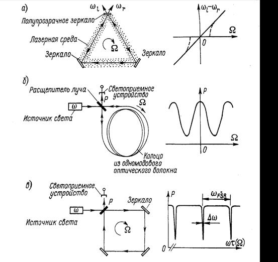 На рис. 3 приведены общие схемы систем, разработанных для повышения точности измерений. Кольцевой лазерный гироскоп (рис. 3, а) отличается высокой частотой световой волны — до нескольких сотен терагерц. Волоконно-оптический гироскоп на рис. 3, б имеет высокую чувствительность, благодаря использованию длинного одномодового оптического волокна с низкими потерями. В оптическом гироскопе пассивного типа с кольцевым резонатором (рис. 3, в) используется острая резонансная характеристика резонатора.