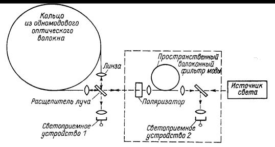 В основной оптической системе, показанной на рис. 4, при использовании светоприемника 1 свет дважды отражается расщепителем луча и, кроме того, дважды проходит сквозь него. При этом условие одинаковой длины оптического пути выполняется не совсем точно и вследствие температурных колебаний характеристик расщепителя луча на выходе возникает дрейф. При использовании светоприемника 2 происходит то же самое. Чтобы световые лучи, введенные в оптическое волокно и излучаемые волокном, проходили одинаковый оптический путь, объединялись и разъединялись в одной и той же точке расщепителя луча, а также имели бы одинаковую моду, необходимо между расщепителями луча установить пространственный фильтр. В этом фильтре желательно использовать одномодовое оптическое волокно — то же, что и для чувствительной катушки.