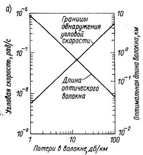 , то гироскоп нечувствителен к очень малым поворотам. Считается, что в системе с оптимальной чувствительностью теоретические пределы обнаружения угловой скорости связаны с дробовым шумом светоприемника. Анализ показывает, что для оптического волокна с потерями a существует определенная длина, позволяющая оптимизировать пределы обнаружения при дробовом шуме: