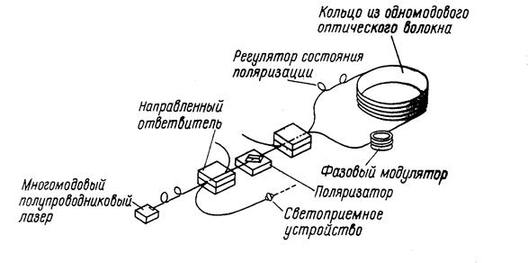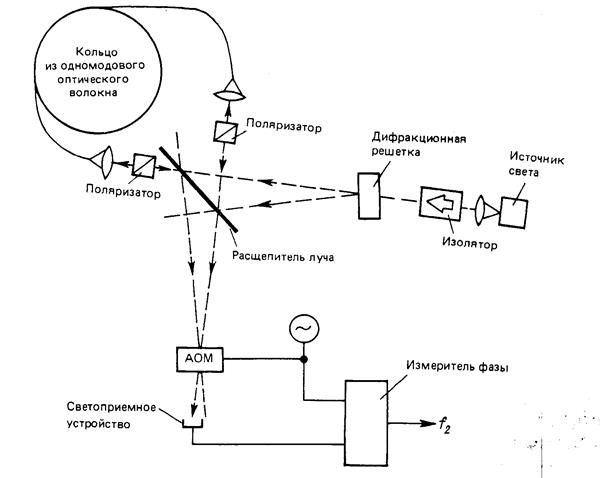 На рис. 4 приведена оптическая схема волоконно-оптического гироскопа. По сути это интерферометр Саньяка (см. рис. 1), в котором круговой оптический контур заменен на катушку из длинного одномодового оптического волокна. Часть схемы, обведенная штриховой линией, необходима для повышения стабильности нулевой точки. Таким образом, разность фаз между двумя световыми волнами, обусловленная эффектом Саньяка, с учетом формулы (5) выражается как