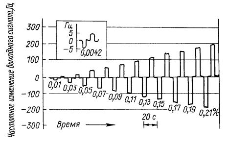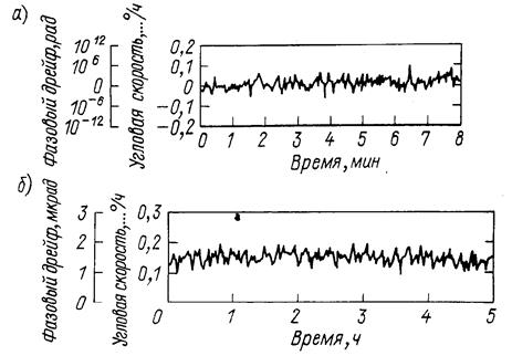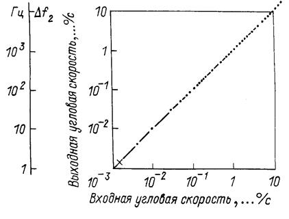 На рис. 15, а поясняется работа данной системы. По вертикальной оси откладывается изменение частоты, которое пропорционально угловой скорости, причем один отсчет соответствуег угловому сдвигу 4" (при 10-кратном усилении 0,4" на 1 отсчет). Скорость вращения земного шара 0,0042°/с, кратковременная разрешающая способность 5°/ч. На рис. 15, б приведена характеристика передачи (вход—выход). Скорость 11°/ч соответствует фазовой разности 180°. Линейность характеристики улучшена благодаря применению нулевого метода. Верхняя граница обнаружения вращения, определяемая электронной схемой, составляет 100°/c, динамический диапазон экспериментальной системы 5 порядков.