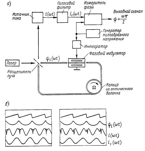 На рис. 12, а представлена система, в которой: сигнал возбуждения фазового модулятора формируется путем интегрирования пилообразного напряжения и на выходе подучается сигнал квазигетеродинирования. На рис. 12, б показано изменение фазы электрического сигнала переменного тока при вращении гироскопа. Имеются и другие попытки реализации квазигетеродинного светового метода на основе фазовой модуляции. Например, система комбинируется со схемой обработки фазы (см. рис. 7), что позволяет расширить динамический диапазон и стабилизировать масштабный коэффициент, т. е. компенсировать недостатки метода фазовой модуляции. В этой системе требуется точная установка параметров формы модулирующего сигнала и трудно добиться технических характеристик, удовлетворяющих инерциальную навигацию. Путем манипуляций с формой модулирующего сигнала практически реализуется нулевой метод, но при этом возникает проблема со стабилизацией нулевой точки.