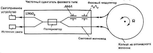 Рис.14. Волоконно-оптический гироскоп с изменением частоты и сдвигатели фазового типа на интегральной схеме |