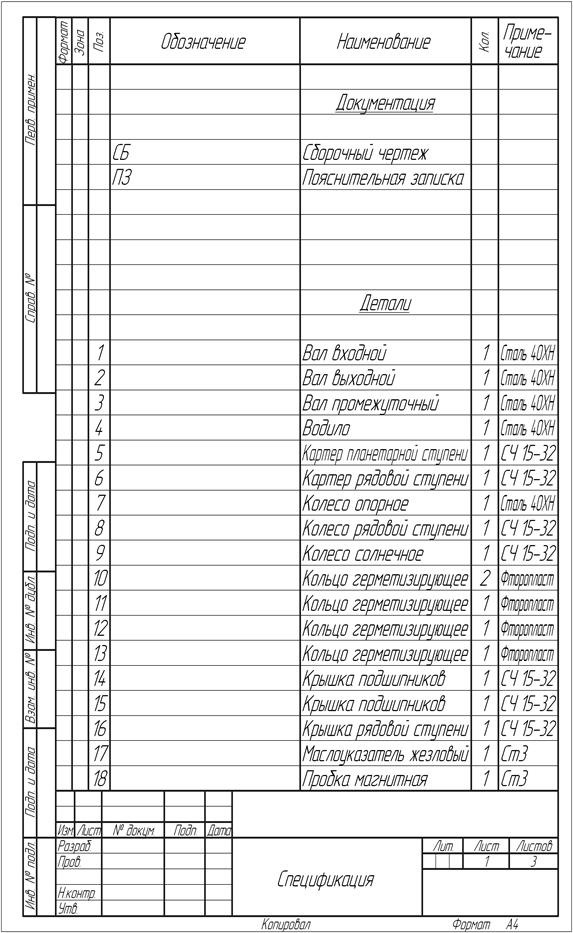Классическим же примером оформления текстовой документации является спецификация прилагающаяся к сборочному чертежу, здесь приведен пример спецификации к сборочному чертежу планетарного редуктора.
