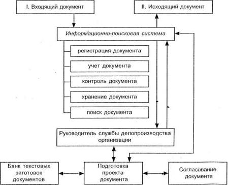 Документооборот организации представлен потоками документов различных категорий, схема движения которых разрабатывается руководителем службы делопроизводства. Общая схема автоматизации движения документов в учреждении показана на рис. 1.