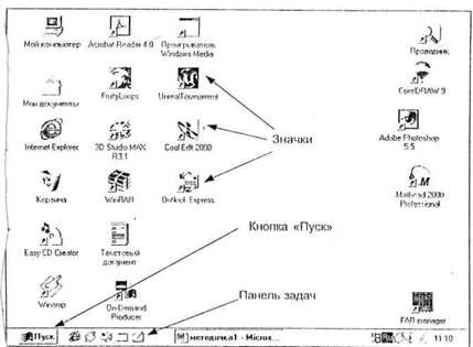 На рабочем столе расположено множество значков. Каждый из них обозначает собой объект: папку или программу, пользовательский файл. Рабочий стол компьютера может быть настроен индивидуально, но обычно он выглядит примерно так, как представлено на рис. 2.