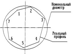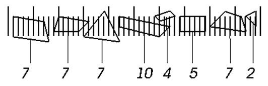 Линейка окуляр-микрометра накладывается на изображение структуры в поле зрения микроскопа. (Полученное изображение структуры схематически показано на рисунке фиг. 128. Зерна карбида вольфрама схематически изображены в виде многоугольников.) Секущая линия окулярмикрометра пересекает крупные и мелкие зерна структуры сплава. На всем протяжении неподвижной линейки замеряется величина каждого крупного зерна в делениях окуляра. В нашем примере на одно поле зрения приходятся зерна следующих размеров: 7, 7, 7, 10, 4, 5, 7, 2 делений окуляра. Затем поле зрения переносят на другие участки шлифа и вновь замеряют размеры зерен, каждый раз фиксируя результаты в протоколе записи первичных данных. Зерна карбида вольфрама замеряются по наибольшей грани при увеличении микроскопа не менее Х1000.