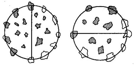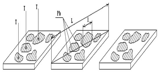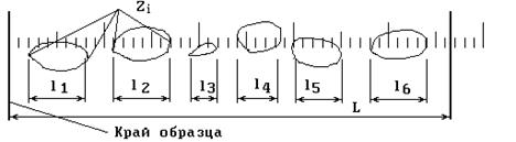 Если пересечь видимую в микроскоп структуру (или ее фотографию) прямой линией, то контуры зерен отдельных фаз структуры рассекут ее на ряд отрезков. На каждую структурную фазу придется определенная (суммарная) длина линейных отрезков, пропорциональная содержанию фазы в объеме сплава. При работе с микроскопами в качестве секущей линии может быть использована линейка-окуляр микроскопа (подсчет производится вдоль обреза линейки).