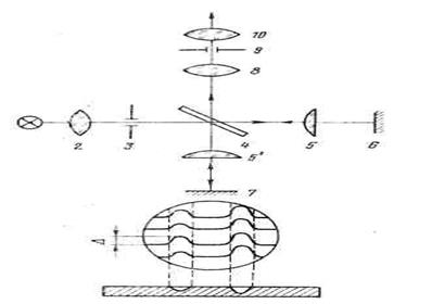 На рис. 1 показана схема двухлучевого микроинтерферометра Линника. В ее основу положен принцип действия интерферометра Майкельсона. Свет от источника 1 (лампа накаливания) проходит через конденсор 2 и диафрагму 3, зеркалом 4 делится на два когерентных пучка, которые фокусируются объективами 5 и 5' на эталонное зеркало 6 и контролируемую поверхность 7 соответственно. После отражения от эталона и изделия пучок проходит через те же элементы схемы и фокусируется линзой 8 в плоскости диафрагмы 9, в которой с помощью окуляра 10 наблюдают интерференционную картину взаимодействия эталонного и рабочего пучков света.