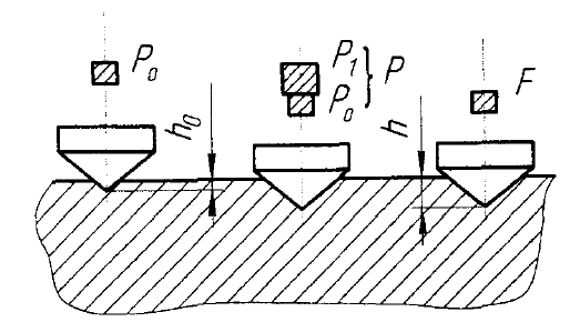 Твердость по Роквеллу: В основном метод измерения твердости по Роквеллу производится по шкалам А, В, С. Сущность метода заключается во вдавливании наконечника 0,2 мм (шкалы А и С) или со стальным шариком диаметром 1,5875 мм (шкала В) в испытуемый образец (изделие) под действием последовательно прилагаемых предварительной Ро , Н, кгс, и основной Р1 , Н, кгс, нагрузок и измерений остаточного увеличения h глубины внедрения наконечника после снятия основной нагрузки и сохранения предварительной нагрузки в единицах измерения 0,002 мм (рис.).