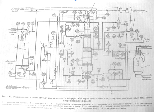 На рис 1.83 представлена функциональная схема автоматизации процесса непрерывной варки целлюлозы в двухсосудном варочном котле типа Kamur с парожидкостной фазой. Пропаренная щепа из пропарочной камеры и варочный щёлок подаются с помощью ПВД и насоса высокого давления в загрузочное устройство отдельно установленной пропиточной колонны 1. Пропиточная колонна предназначена для глубокой жидкостной пропитки щепы варочным щёлоком под высоким давлением. В период пуска требуемое гидравлическое давление устанавливается с помощью регулятора PIC-1, осуществляющего сброс избытка щелока в нижний испарительный циклон. В дальнейшем, клапан регулятора PIC-1 закрыт и работает лишь как предохранительный клапан.