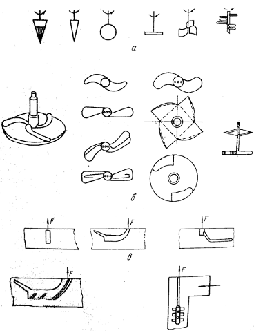 На рис.1 приведены схемы устройств первичных измерительных преобразователей — чувствительных элементов — датчиков концентрации массы роторного типа для открытых емкостей (рис. 1, а) и для напорных трубопроводов (рис. 1,б), а также датчиков обтекания (рис. 1, в).