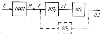 В настоящее время к ПИП подключаются стандартные пневмосиловые или электросиловые уравновешивающие преобразователи, которые кроме ИП2 содержат измерительные преобразователи ИП3 и обратные преобразователи ОП4 , уравновешивающие измеряемое усилие F и осуществляющие его преобразование в стандартные пневматические или электрические аналоговые сигналы. В этом комплекте используются измерительные приборы ГСП типа ПВ или КПУ и КСУ соответственно.